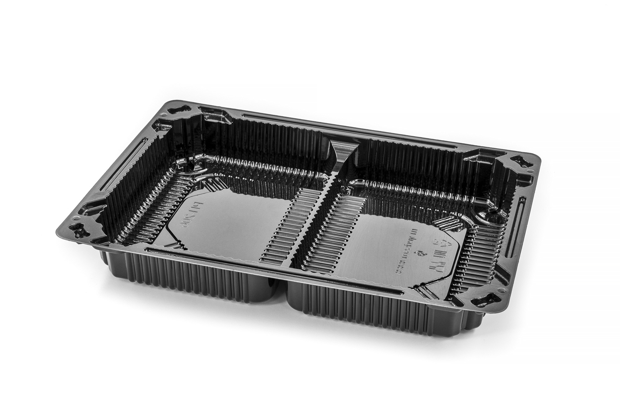 Двухсекционное дно контейнера РП-206 из полистирола. Подходит для доставки и продажи суши и роллов. Предназначено для использования с прозрачной совместимой крышкой.