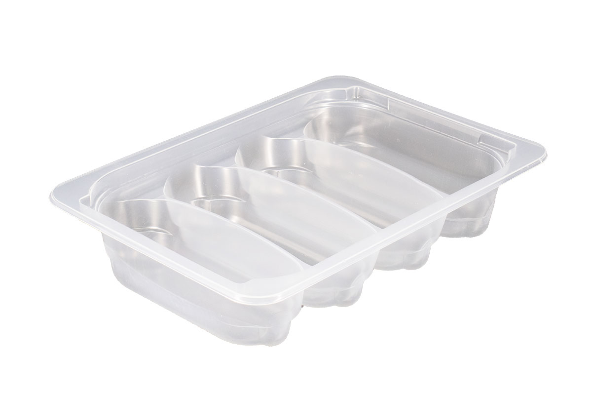 Одноразовый пластиковый лоток размером 210х148х45 мм для упаковки котлет на пищевом промышленном производстве.