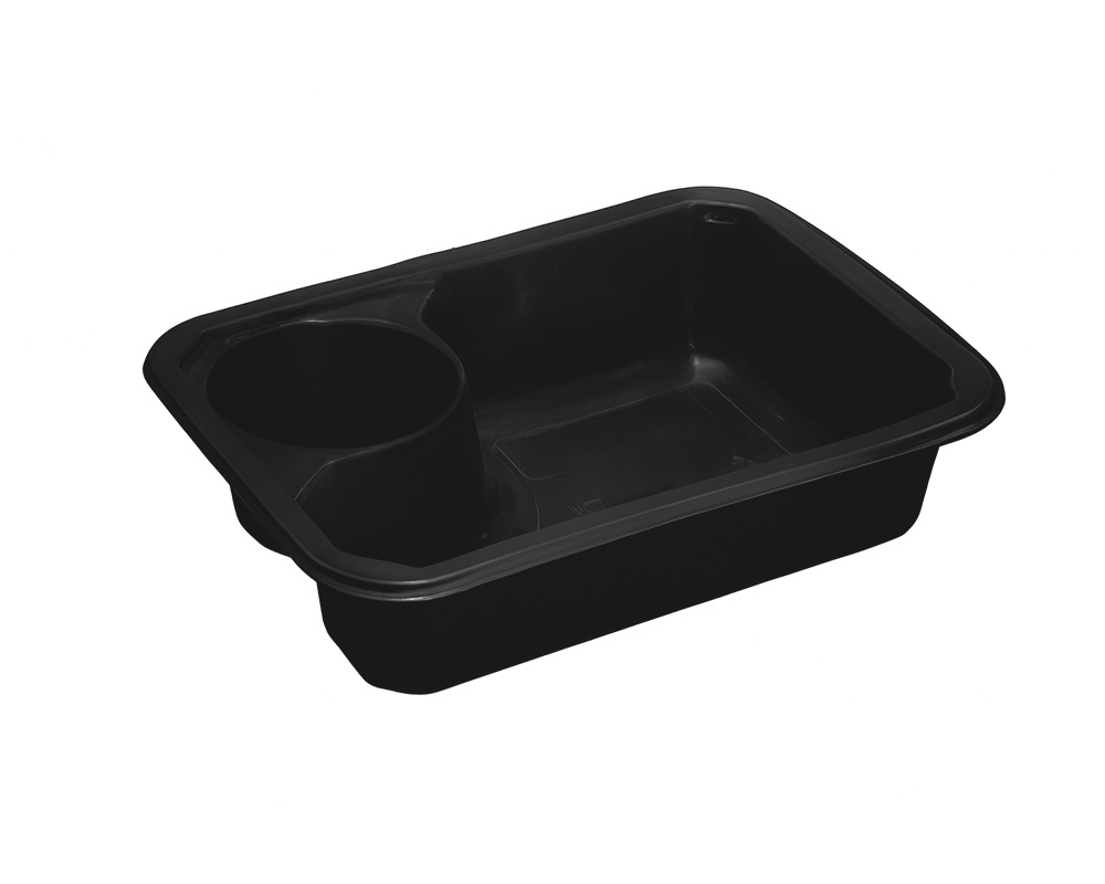 Инновационный лоток со встроенным отделением для соуса или дополнения. Идеально подходит для упаковки готовых обедов, мясных и рыбных блюд с соусом, а также салатов с заправкой отдельно.