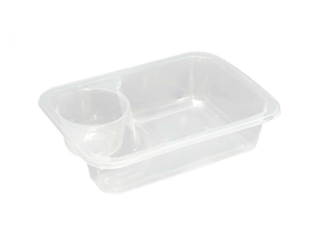 Инновационный лоток со встроенным отделением для соуса или дополнения. Идеально подходит для упаковки готовых обедов, мясных и рыбных блюд с соусом, а также салатов с заправкой отдельно.