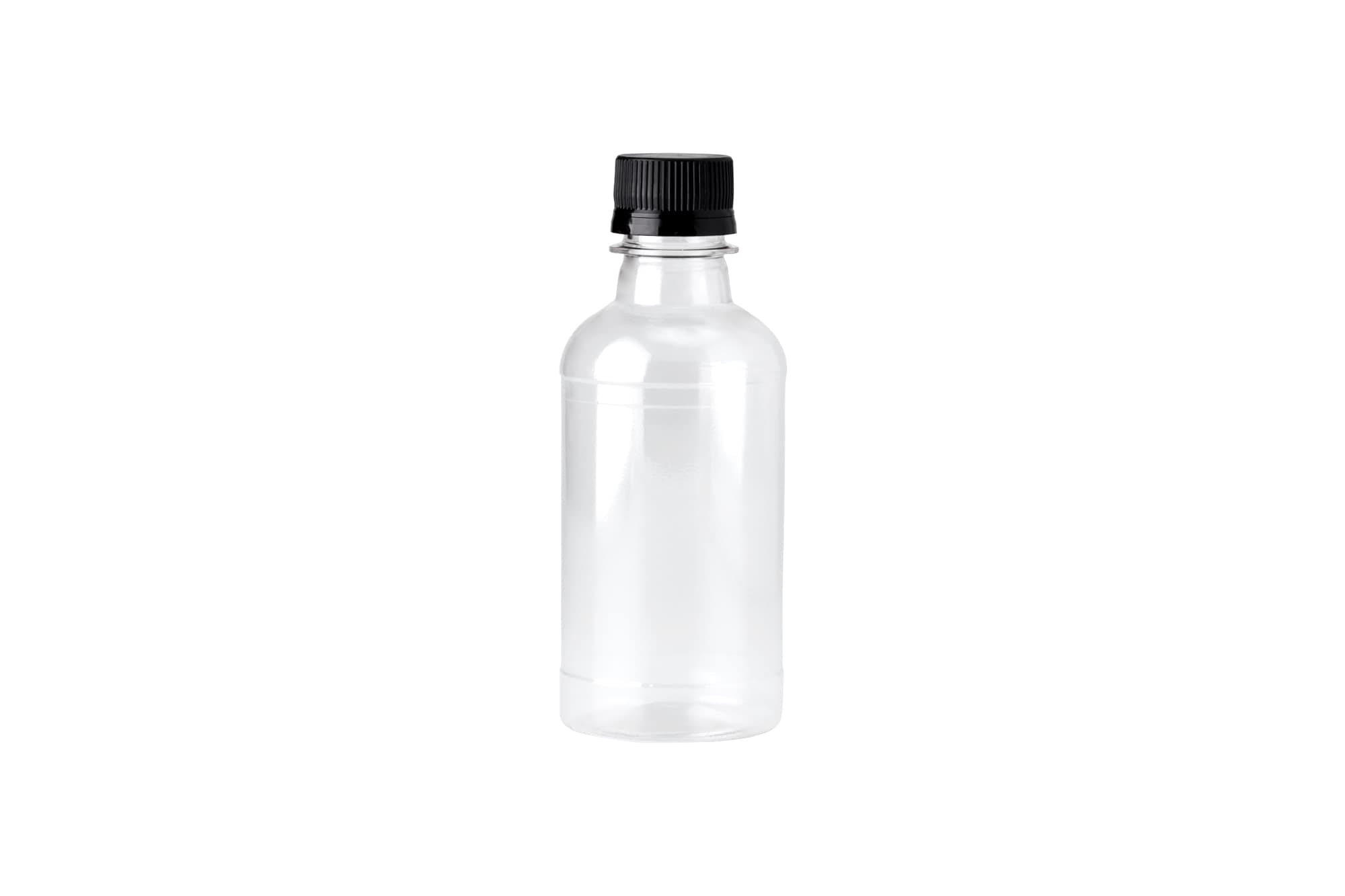 Бутылка 0,25 л прозрачная круглой формы с колпачком.