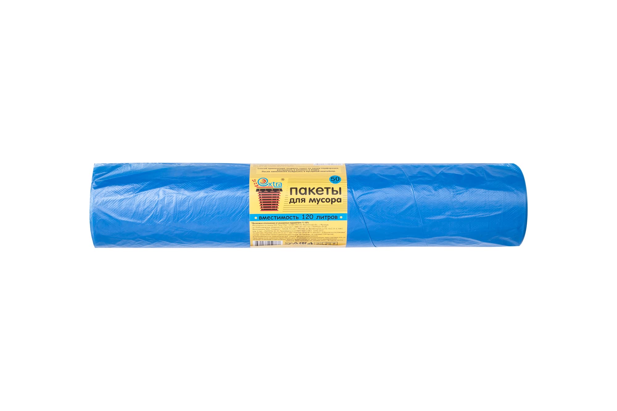 Рулон одноразовых синих пакетов для мусора. Пакеты изготовлены из полиэтилена низкого давления. Размер пакетов 70х110 см. Вместимость 120 литров.