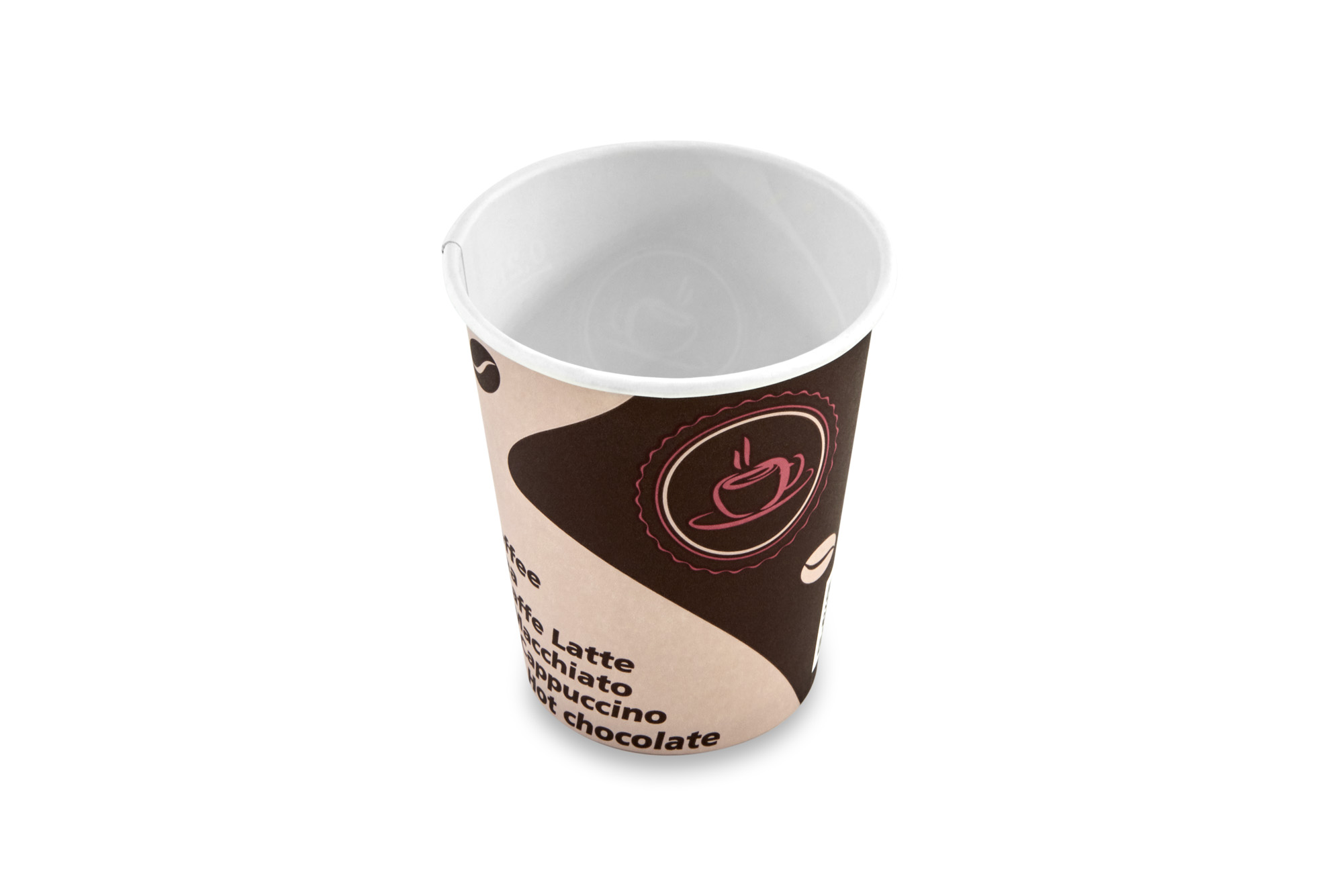 Стакан бумажный однослойный с кофейным дизайном. Подходит для горячих напитков.