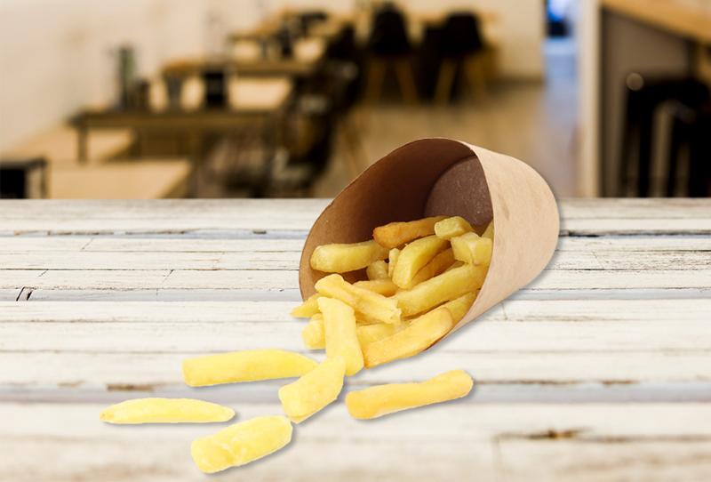 Одноразовая бумажная упаковка для картофеля фри, картофеля по деревенски в виде бумажного стакана набирает популярность на рынке фастфуда благодаря своему удобству. В отличии от популярной коробочки для картофеля фри стакан ну нужно формировать так как он сразу готов к использованию. У стакана не может быть отверстий в дне, в отличии от коробочки и соответственно клиенту удобнее пользоваться стаканом. В стакан под картофель фри помещается 200-250 грамм продуктов. Благодаря плотным стенкам им удобно пользоваться на ходу. Ламинация внутренней поверхности стакана предотвращает нарушение целостности изделия при контакте с жирами.